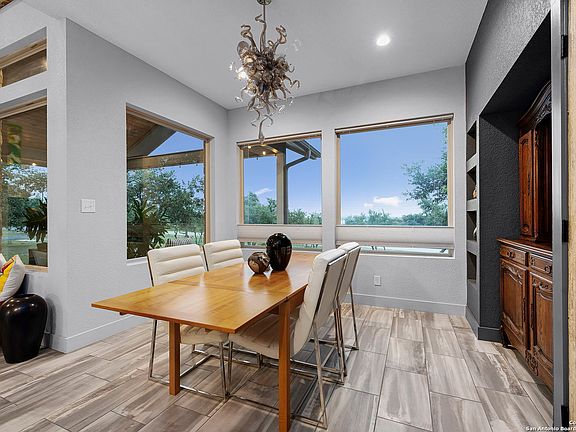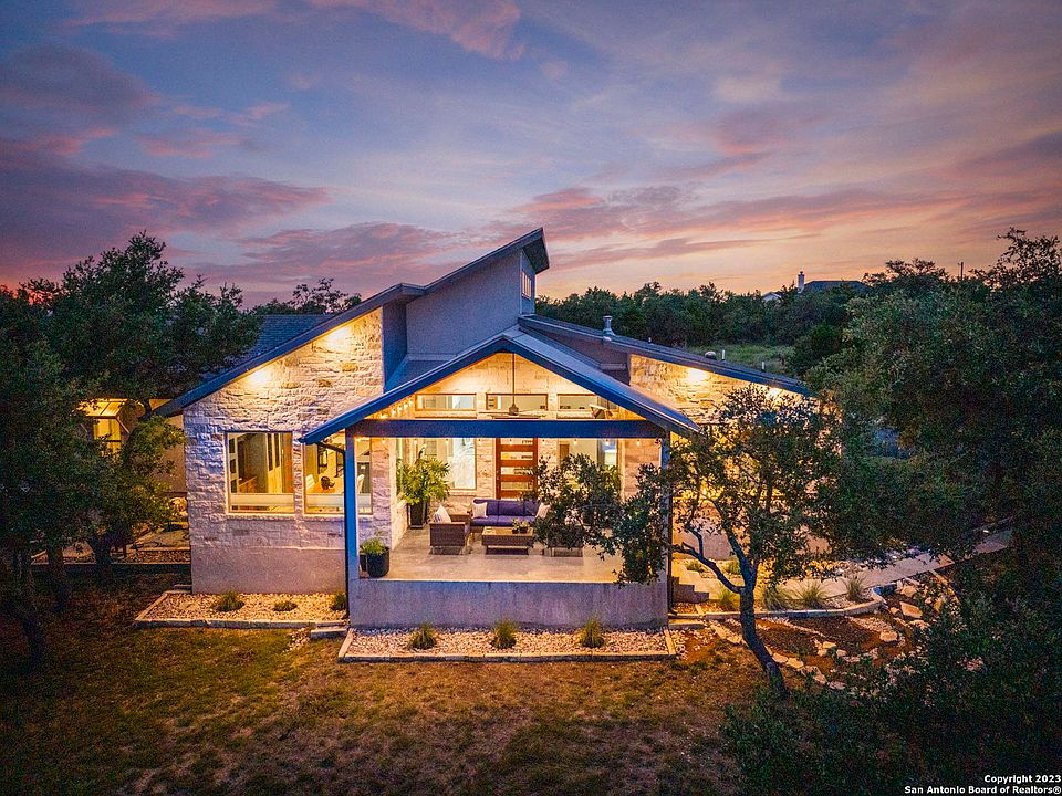 Located in a gated community on an acre lot, this meticulously maintained modern hill country home has it all! The inviting front porch provides a relaxing breeze to enjoy the hill country views. Inside you will find an open floor plan, tile floors throughout, soaring ceilings and an abundance of natural lighting allowed in by the oversized picture windows. The floor to ceiling tiled gas fireplace provides a soothing focal point. The kitchen has a gas stove/oven combo and an electric oven allowing for multiple dishes to be cooked simultaneously. The island offers endless storage with both shelves and drawers on the front side. A serene master suite offers stunning views and a spa-like bathroom with double walk-in closets, a soaking tub and large shower. The two secondary bedrooms are on their own end of the home sharing a full bathroom with a walk-in shower. A half bath is strategically located to close to the kitchen for dinner parties. The office space is the perfect set up for remote working with custom built-in storage or could easily be used as a fourth bedroom if needed. A 200 SF partially finished casita with utilities and an outdoor shower can easily be used as additional living space or whatever fits your needs. Additional features include a whole home water filtration and softener system, tankless water heater, backup generator connection, custom window coverings, a large walk-in pantry, an oversized garage with a dedicated workspace and overhead storage, and a stone fire pit that is perfect for roasting S'mores after a game of Bocce ball in the front yard. Added bonus, this property has plenty of level room for parking!