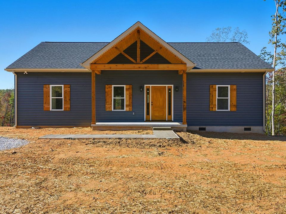Nestled on a private country setting just minutes from the Town of Amherst, this brand-new craftsman-style home blends rustic charm with modern comfort. Featuring 3 bedrooms and 2 full baths across 1,440 sq. ft., the open-concept floor plan boasts vaulted ceilings, luxury vinyl plank flooring, and a stunning shiplap gas fireplace as the focal point of the living room. The bright kitchen offers granite countertops, white shaker cabinetry, stainless steel appliances, and an island for gathering. The spacious primary suite includes a double vanity, walk-in closet, and relaxing soaking tub. Enjoy peaceful wooded views from the large rear deck, perfect for outdoor entertaining. With its timeless design, natural finishes, and convenient location, this newly built Amherst County home is move-in ready and waiting for its first owners.
