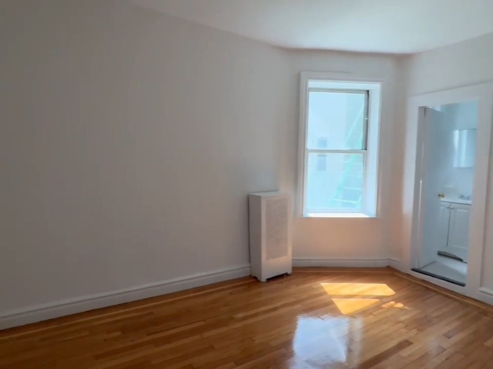 Step inside to find a sun-filled living room with gleaming hardwood floors, fresh paint, and large windows that bring in plenty of natural light. The renovated kitchen features new cabinetry, modern appliances, and ample storage space, perfect for everyday cooking. The bedroom comfortably fits a queen-sized bed and includes a large closet for storage.