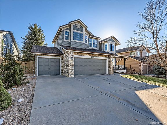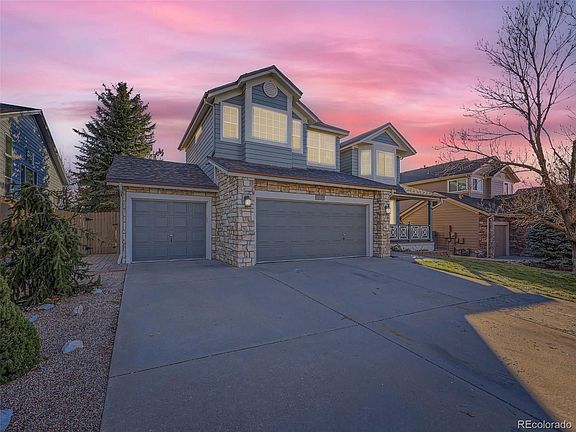 Immaculate two-story 3-bed/3-bath home with a 3-car garage located in Villages of Parker neighborhood within the Canterberry Crossing Covenant Controlled Community! Enter via the welcoming covered front porch. This home has a gorgeous kitchen with ceiling-high cabinets, granite counters, an island that seats up to six people, energy-saving SS appliances, a pantry with a designer door, a double convection oven/microwave, modern lighting, tile flooring, low UV windows in the family room and tiled fireplace and surround sound in the family room. Note the stylish main-level powder room and upper-level Jack & Jill bathroom! New carpet was replaced throughout the home in 2021. The main level also has a living room, dining room, and laundry room with a utility sink that opens to the garage. The upper level includes the primary bedroom with a 5-piece ensuite bathroom in addition to a second full Jack & Jill bathroom between two additional bedrooms. Enjoy the 8-person hot tub privately located on the large sweeping stone patio with additional dining space and a fire pit area for entertaining. The professionally landscaped fully fenced yard backs to a spacious greenbelt for that extra separation from the backyard neighbor. Sprinkler systems are located in both front and rear. The basement has a radon mitigation system, is plumbed for a 4th bathroom, and has two egress windows for future conforming bedroom(s). Furnace & A/C were replaced in 2019. Water heater was replaced in 2022. Roof was replaced in 2019. Douglas County School District RE-1 includes nearby Pioneer Elementary & Legend High School. Many trails, parks, dining, and shopping are nearby in addition to a pool and golf course! Enjoy the tour!