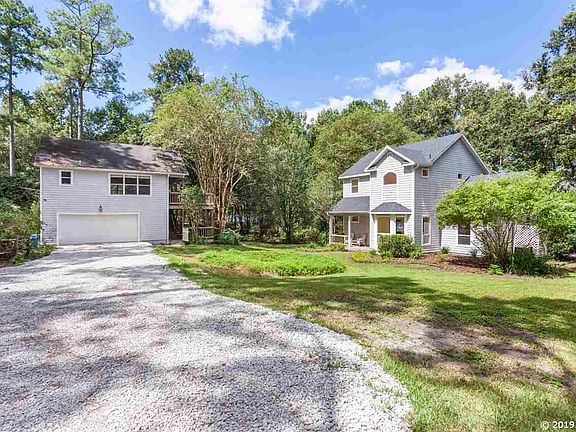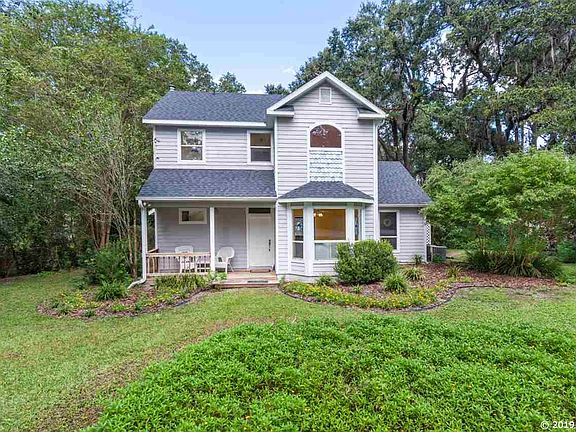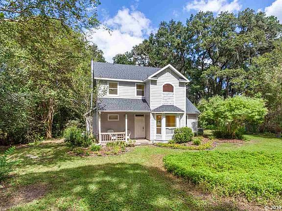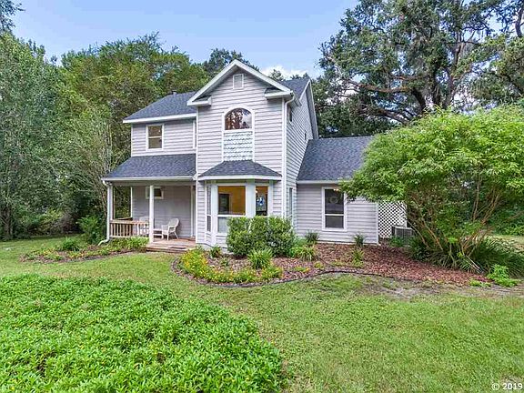 The Perfect get away Retreat! 2.73 acres double lot with longleaf pines and ancient oaks, and +217ft frontage on pristine Lake Elizabeth. Upstairs is the master suite with bedroom, walk-in line cedar lined closets, master bath with shower and antique claw foot tub, plus office with a full bay window with lake view and second bedroom/study (upstairs can easily be made into 2 bedrooms by adding a door.) Features include gas fireplace, heart pine floors (Goodwin Lumber) and a brass chandelier. Downstairs is the living room, dining room, kitchen (with glass and maple cabinets and gas stove), breakfast bar, eat-in breakfast nook, guest bedroom and bath. The house is energy efficient with a dual heating/air conditioning system and a Vermont Castings wood-burning stove. Wonderful natural light in every room, high ceilings and custom stained glass door panels, and scones. Tile floors and porches front and back as well as a generous back deck! Detached oversized two-car garage and a mother-in-law suite/studio (625 sq. feet) with oak floors, kitchen, bath, and spacious decks. Mature landscape w/ camellias & oranges. Less than 10 min to Melrose;20 min to Gainesville or Ocala