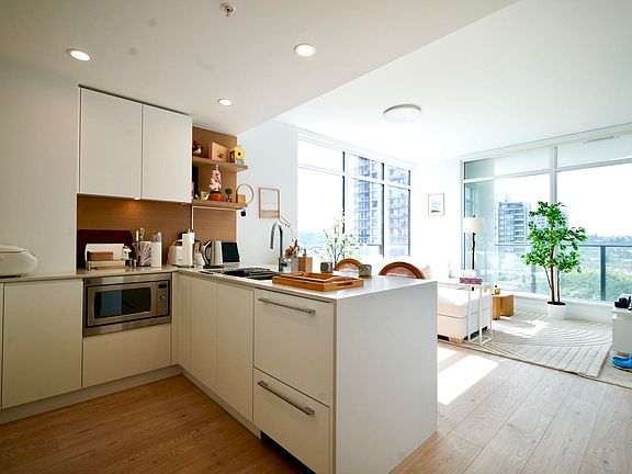 Opportunity to be a proud owner in Akimbo by Imani Development. The bold architectural design of the building defines the Brentwood skyline. This 2 bedroom 2 bath corner unit features a functional layout, beautiful state-of-the art kitchen with integrated appliances, spa-like bathrooms, clean finishing. Enjoy the covered balcony. The building comes with many amenities as well. Take advantage of the convenience this location offers as shopping, groceries(t&t opening soon), dining, entertainment, banking are just minutes away at The Amazing Brentwood. Transit oriented as it's just a 3 minute walk to Gilmore Skytrain Station. The included parking stall comes with EV charging. Pets and rentals allowed. School catchments are Kitchener Elementary, Alpha Secondary.