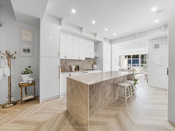 Toronto's condo market is saturated with sameness, but Suite 409 quietly resists. Fully renovated in 2023, this 2+1 bedroom, 3-bathroom Parisian-inspired suite offers over 1,500 square feet of timeless, family-friendly living and is a space designed to leave a lasting impression in the heart of Yonge and Eglinton. Herringbone floors run throughout, complemented by 10-foot ceilings, solid-core doors, crown moulding, and corbels that add texture and elegance. Oversized west-facing windows invite soft light throughout the day and frame a vibrant cityscape below. The kitchen balances beauty and function, featuring Taj Mahal quartzite counters, a large island, full-height cabinetry, a deep sink, and an entire pantry wall. Integrated appliances keep the aesthetic clean and modern. The space flows into a generous living and dining area with floor-to-ceiling windows and a walkout to a private west-facing balcony, ideal for coffee or evening wine. The den is a versatile, enclosed space that functions seamlessly as a home office, guest space, or third bedroom. The primary suite includes two walk-in closets (one for daily use, one for deeper storage), space for a king bed, a desk and reading nook, and a refined ensuite with natural stone, large-format tile floors, and a glass shower. A second bedroom features its own ensuite with a deep soaker tub and walk-in closet. Additional highlights include a powder room, full-size laundry, premium parking next to the elevator, and an oversized locker attached to the space (approx. 5.5' x 5.5' x 8.5') for spacious and secure storage. Just a two-minute walk to Eglinton Station and the upcoming LRT, with top schools, boutique shops, and fitness studios nearby. Building amenities include 24-hour concierge, business centre, gym, party room, guest suites, sauna, and more. Suite 409 offers the function of a house, the charm of a Paris apartment, and the ease of condo living, a rare find in one of Midtown's most connected neighbourhoods.