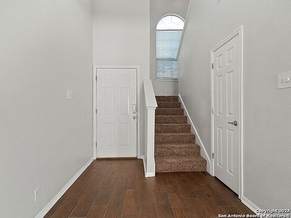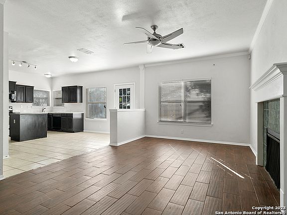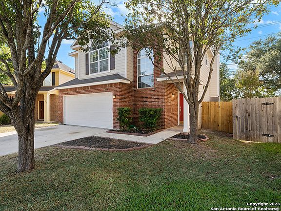 Welcome to your dream home in the highly desirable Vistas at Stone Oak community! This beautiful 3-bedroom, 2.5-bathroom residence offers the perfect blend of style and comfort. From the charming curb appeal with its bold red front door to the spacious 2-car garage, every detail has been thoughtfully designed. Step inside to a bright and inviting living area featuring wood-look vinyl flooring, a cozy fireplace, and a ceiling fan-ideal for both relaxing nights in and entertaining guests. The chef-inspired kitchen is sure to impress with sleek black cabinetry, stainless steel appliances, a large island, and a convenient breakfast bar for casual dining. Don't miss your chance to make this home yours!