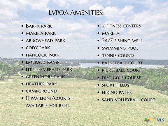 - Community features: Barbecue, Basketball Court, Boat Facilities, Clubhouse, Fitness Center, Fishing, Golf, Pier, Playground, Park, Airport/Runway, Sport Court(s), Tennis Court(s), Trails/Paths, Community Pool, Dock