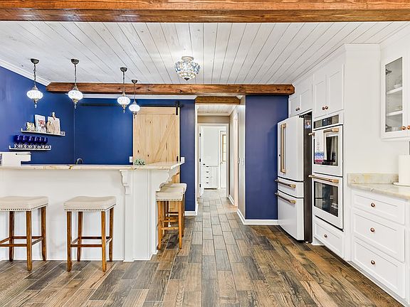 Nestled on a generous 5-acre estate, this meticulously renovated two-story home has comfort and style. Enjoy nature from the extended front porch and balcony, where you can soak in breathtaking sunsets and the gentle morning dew. Step inside to discover a custom-designed interior. Every detail has been carefully considered to create a space that exudes warmth and sophistication. The main level features a spacious primary bedroom and primary bathroom. Unwind in the timeless bear claw soaker tub or refresh under multiple shower heads, including a soothing rain shower head. A gourmet kitchen awaits with high-end GE Cafe appliances and a striking copper farmhouse sink. Plantation shutters throughout the home provide privacy, natural light control, and a touch of timeless elegance, enhancing the overall aesthetic. Handcrafted marble countertops throughout the home, with granite in the bathrooms, ensures both durability & beauty. Upstairs, you'll find oversized bedrooms that offer ample space for your family's needs. Consider transforming one into a media room for movie nights and entertainment. The roof was newly replaced in 2023, ensuring long-term peace of mind. The exterior received fresh paint and trim in 2022, preserving its exterior beauty and curb appeal. A handcrafted cedar mantle was added in 2022, creating a focal point of natural beauty and craftsmanship. The home also boasts a wet bar, perfect for entertaining. The front yard has been improved with sod and landscaping.