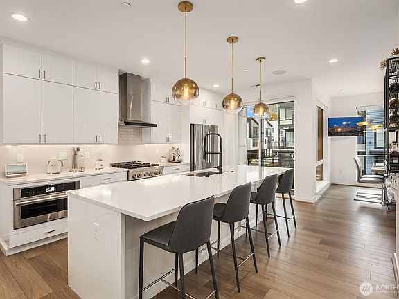 Experience modern living in luxury community w/contemporary architecture & exceptional finishes. This sun-filled 3BR/3BA residence, ideally situated w/views of central park, is loaded w/$80K+ upgrades. Home features upgraded countertops, tile & carpet, 3-floor zoned heating & cooling, acrylic flat panel cabinets, Jennair gas range & under counter beverage cooler, 42-inch gas fireplace & wood mantel, EV charger, central A/C, Google smart home & built-in speakers w/Sonos. 9-foot ceilings & large windows on each floor. Primary suite is a true retreat w/double vanities, generous walk-in shower & walk-in closet. 2 additional bedrms each has own bath. Top-rated Northshore SD! Great location w/excellent commuter access. Close to all the amenities.