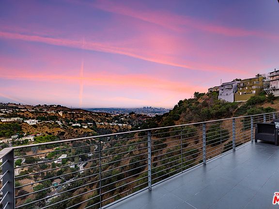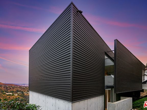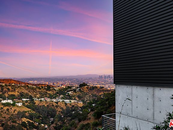 Designed for entertaining and comfort, this distinctive metal-clad residence showcases 180-degree unobstructed, impressive views of Laurel Canyon and DTLA. Set on a downslope with all of the bedrooms on the lowest floor, you'll have three-levels of striking expose-concrete exterior and an open living, dining, and kitchen set on the middle level. The completely gated entry exudes a sense of exclusivity and lures you in to explore further. Inside, this custom home features towering 20-foot ceilings and walls of glass that combine to create a breathtakingly beautiful interior. A gas firewall warms the living room while in the kitchen, theres a suite of Viking appliances, Caesarstone countertops, and stunning marble details. Taking full advantage of the sought-after location are the sweeping entertaining decks that perfectly capture the views. More incredible features include poured concrete walls, spa, a Control4 system, along with a large 2-car garage.