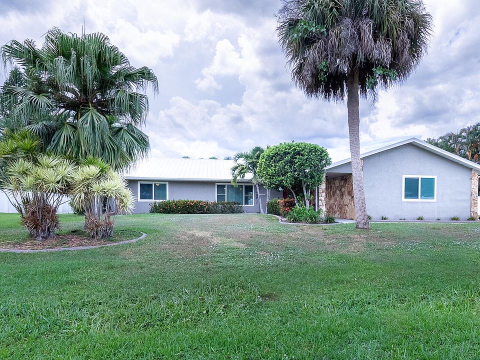 PRICE REDUCED!!!! Corporate Owner. Lovely updated 3 bedroom/2 bath/2 car garage home on a 1/2-acre lot in the Sandpiper Bay area. This home boasts an open floor plan and split bedrooms. Kitchen has been remodeled with white cabinets, granite counters, stainless-steel appliances and large breakfast bar. Home has upgrades including but not limited to impact glass, fabric shutters, humidity-controlled A/C, newer metal roof, new electrical panel 2021, newer hot water heater, cathedral ceilings, wood burning fireplace, water-proof luxury vinyl flooring. Backyard has a heated saltwater pool. Large, covered patio area and privacy fence. No HOA. Close to shopping and so much more. Some photos have been virtually staged.