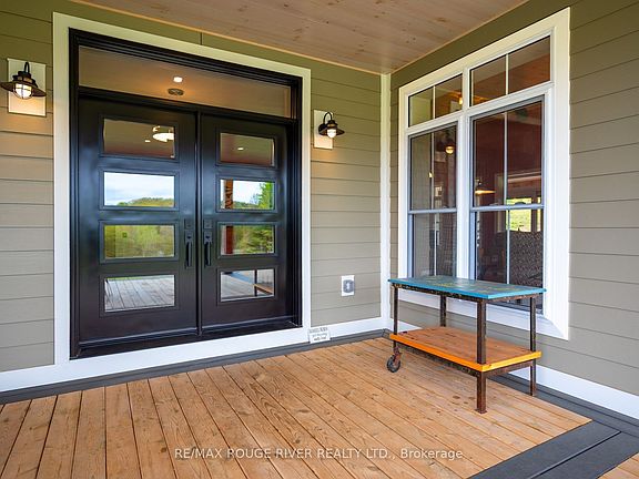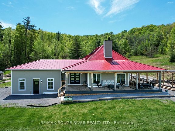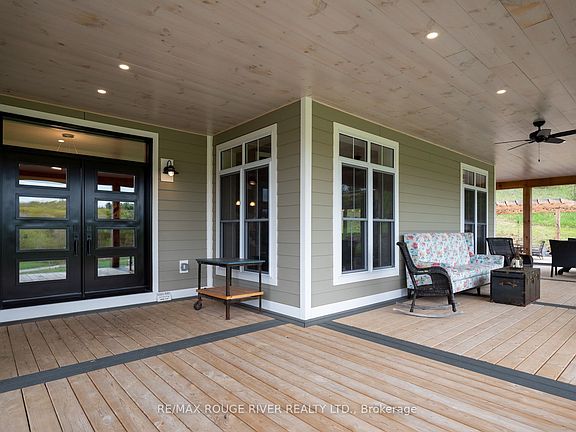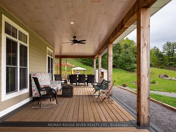 Crafted with precision and completed in 2022, this stunning custom-built home offers refined living in a private, natural setting. Sited on 37 acres of rolling countryside with panoramic views, walking trails, and thoughtfully designed outdoor spaces, this property is a rare retreat just minutes from town. Step inside to a breathtaking great room with 21' vaulted ceilings, anchored by historic beams, and a striking STUV airtight fireplace. The chefs kitchen is a true showpiece, featuring leathered granite countertops, cherry cabinetry, and a premium Monogram range and hood ideal for both everyday living and entertaining. The main floor includes a luxurious primary suite with a spa-inspired ensuite and custom dressing room. Two additional bedrooms each feature their own 4-piece ensuite baths, providing comfort and privacy for family or guests. The beautifully finished lower level with a walkout expands your living space with two more bedrooms (or home offices), additional living space, and ample storage. Outside, enjoy a full wrap-around covered porch perfect for alfresco dining, a gazebo, and open-air lounging areas all designed to capture the stunning views across your private acreage. A true blend of luxury, tranquility, and craftsmanship