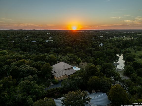 Nestled on a cul-de-sac in the serene Cypress Springs on The Guadalupe neighborhood, this stunning custom home offers 3,272 square feet of luxurious living space on 4.39 acres at the top of the Guadalupe River. This residence features 3 spacious bedrooms, a study, and 3.5 bathrooms. The entertainment room upstairs is bathed in natural light from the wall of windows which showcase the panoramic view of the infinity pool and river, along with a full bathroom and large covered patio. The gourmet kitchen is a chef's dream, boasting custom cabinetry, 5 top burner gas cook top, high-end appliances, and a charming breakfast nook. The expansive living area, with fireplace, is perfect for entertaining, with custom sliding doors that lead to the covered patios showcasing the breathtaking views of the surrounding hill country, infinity pool, and panoramic view of the Guadalupe River. Access to the river is at your fingertips in your own backyard. The primary suite is a true retreat, complete with a luxurious en-suite bathroom featuring a soaking tub, walk-in shower, and dual vanities. The oversized primary closet has built-ins, along with windows allowing the natural light and views of tree tops from the front yard. Don't miss the opportunity to live just minutes from top-rated schools, parks and shopping, yet secluded in your own tranquility of the Texas Hill Country!