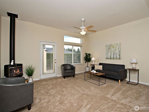 Welcome to Water Gardens, a beautifully maintained 55+ gated community. This inviting 2-bedroom plus den home offers an open floor plan w/NEW carpet, NEW roof, new interior and exterior paint & NEW LVP flooring in the kitchen, dining & both baths. The spacious kitchen opens to a comfortable living & dining area, & includes a freestanding gas stove adding warmth & charm. The primary suite features a walk-in closet & double sinks. The utility room w/ sink & storage leads to garage. Step out back to a Trek deck, garden space & fenced backyard w/ a storage shed. Mt. Rainier View! Community scenic ponds, waterfalls, and social events all within minutes of Maple Valley & Covington. Optional RV parking available. Extra $35/month for lawn mowing!