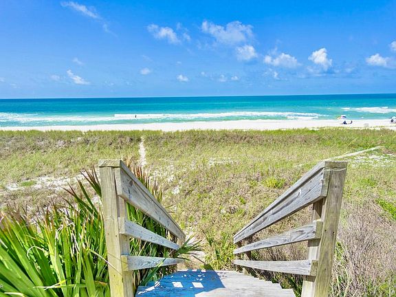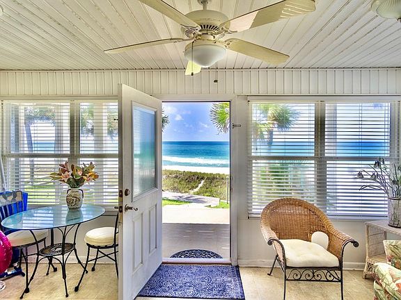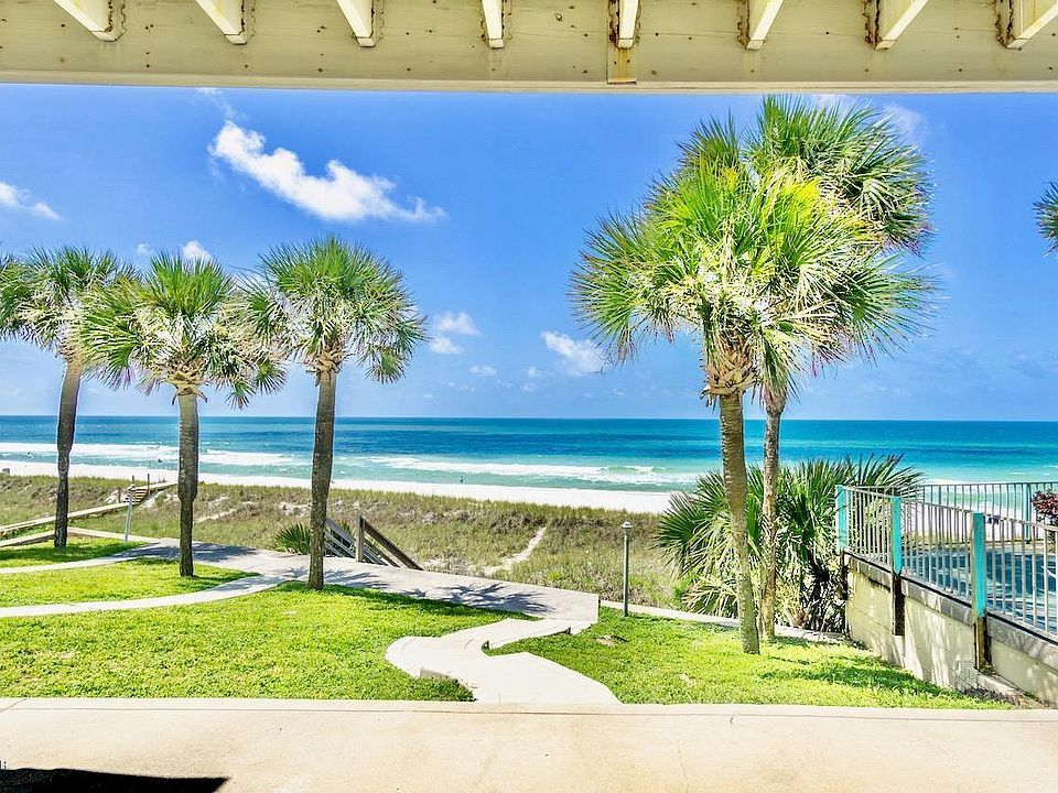 CURRENTLY UNDER CONTRACT, SELLER ACCEPTING BACKUP OFFERS. Step right out your door to the gorgeous white sand and emerald waters of the beach! Imagine owning luxurious Panama City Beach oceanfront with your own lawn, sidewalks, palms, and seawall! This unit is light, bright, and beautifully decorated; kitchen has been updated with designer cabinets and corian counters. Watch the gorgeous Gulf of Mexico sunsets from kitchen/ living area and master suite upstairs! It is sold furnished except for some personal items. This three townhome complex has a seawall which is rare. No association fees as you own your lot. The three units share the cost of common areas. This unit has never been rented. It is across from one of the local's favorite cafes, Sunnyside Grill!