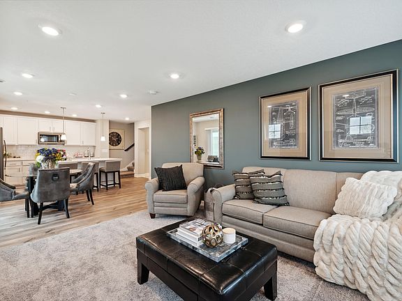 Model Townhome to tour - END/CORNER location. Two-stories with large windows on the front & side walls. Open main level layout flowing from family room to dining area to kitchen. A designer-styled kitchen with white cabinetry, quartz countertops, stainless steel appliances, gas stove, center island, deep sink & backsplash. The upper level features three bedrooms plus a loft for additional gathering space or home office/study. Also, two bathrooms up with laundry closet. Extra-large owner's suite with walk-in closet. Private owner's bath with 5-ft. walk-in shower & double-sink vanity. Side patio and yard for outdoor space. Built to be move-in-ready complete with window blinds, washer/dryer, water softener, "smart" home features and more. Two-car garage.