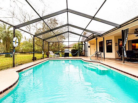 Contact the Official Listing Agent Tracie Maler. Light airy rooms soak up the sun! Enter the through double wooden doors and take in the view! Beautiful wood laminate flooring gives a rich feel to the open living room with vaulted ceilings and a stone fireplace. Propane will make the fire easy to light! Triple sliding glass doors 'pocket' to open the living room to the lanai to create additional living space. Outdoor living at its finest! the screened and covered lanai 30'x10' +/- , has cabinets, sink and fridge, cable hook-up, pool bath. Lazy days spent relaxing in the solar- heated diamond- bright pool are sure to delight you! The homes unique layout has 3 private bedrooms with large walk-in closets. Master suite includes sliders to pool, walk-in closet, dressing area with sink, bathtub and separate shower. Kitchen has breakfast bar, pantry and table space, along with pool access. Plenty of storage with closet at front door, linen closets, pull-down stairs in garage. Septic pumped 2017. Tinted windows. Fenced yard.