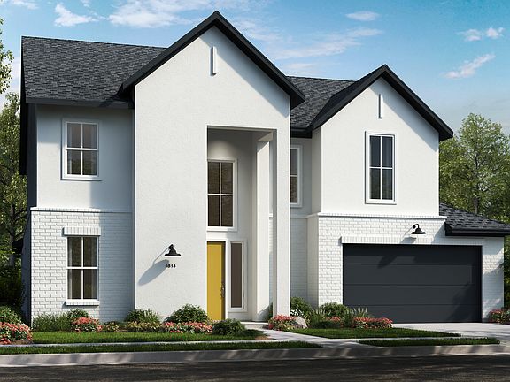 This modern style two-story floor plan from the Darling Modernist Collection features a welcoming foyer with soaring ceilings and a guest suite ideally located at front of the home. Continuing down the foyer the 5814 plan opens to a kitchen with an over-sized walk-in pantry, dining area and gathering room with a cozy fireplace. Walk outside to the covered outdoor living area to enjoy the outdoors and bring light into the home. The study off the kitchen and dining room features double doors and creates the perfect work-from-home space. The owner's suite is at the back of the home providing a peaceful haven with a large walk-in closet, that has convenient access to the laundry room. The second floor features a loft style game room and two additional bedrooms featuring private bathrooms and walk-in closets with each.