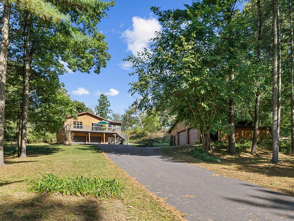 Welcome home to this delightful 2-bedroom,2-bath residence situated on 1.5 acres! If you love country living, wildlife, & privacy, this property is perfect for you. It features a 2.5-car detached garage along with an attached 2-car garage. The main level offers an open-concept design, including a cozy living room with a natural fireplace, a dining area, and a kitchen. The master bedroom boasts a walk-in closet, and the bathroom includes a jetted tub. You'll also find an updated 4-seasons room that adds to the charm of this home. Step out onto the large deck to savor your morning coffee while enjoying the peaceful surroundings. The lower level features an additional bedroom and a 2nd bathroom, along with a brand-new hot water heater. Hardwood floors run throughout. A truly perfect retreat!