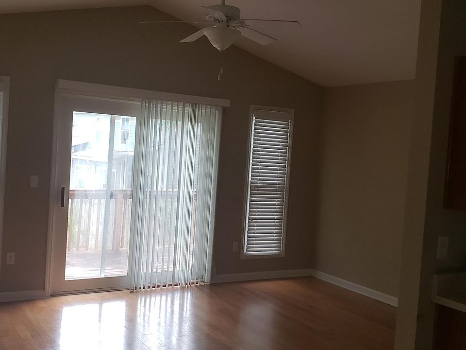 Nice deckVaulted ceilingsModern kitchenWood floorsDouble closets