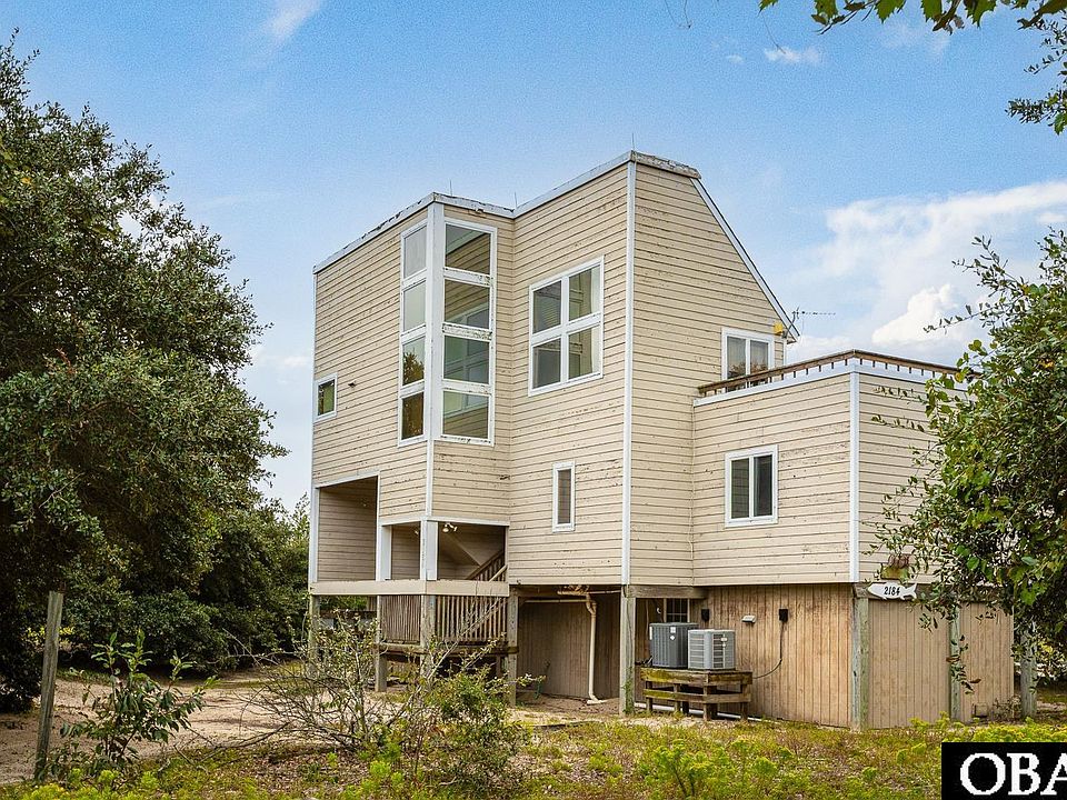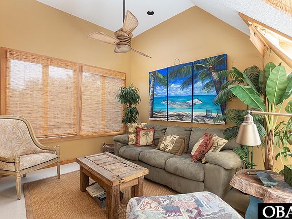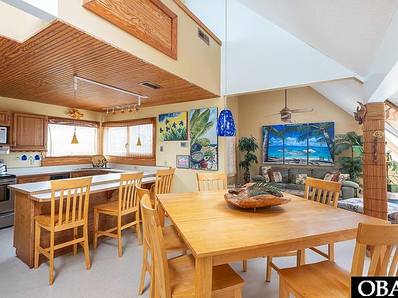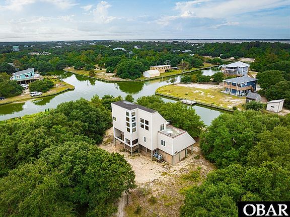 Welcome to this gem tucked amongst the live oaks on a secluded canal. This house was designed by the famed architectural firm Devrouax & Purnell out of Washington DC. It was constructed in 1985 originally in Corolla as an Oceanfront, but later found its current home Canalside on Carova Beach. The top floor of the home overlooks the oak trees with views of the canal from multiple locations. It was designed with a wedge shape to protect against hurricane winds, which are meant to swoop over the building. The top floor of this iconic home contains the living room, dining room, kitchen with a ladder leading to the loft space, which can be utilized as flex space. The house features 5 balconies, a large electric fireplace, set in custom wood paneling, skylights, and an entirely unique layout. The design of this house is original and unique yet easily transformed into a contemporary house plan. The current owners have lovingly infused their style into this home, its furnishings, and artwork making it truly one of a kind.