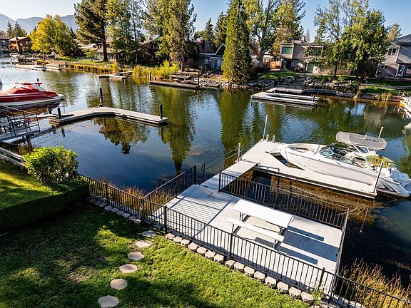 Enjoy the epitome of waterfront living in this Tahoe Keys home, a true boater's paradise with expansive water frontage and a rare U-shaped dock capable of accommodating up to three boats. Located on one of the premier streets in the Keys, this meticulously maintained split-level residence blends timeless design with highly desirable amenities. One of the very few Tahoe Keys properties to feature a three car garage, this home offers both practicality and prestige with one bay tall enough to store a boat on a trailer. A paver driveway enhances curb appeal, while a bear resistant trash enclosure provides convenience and compliance with Tahoe's wildlife requirements. Outdoor living is equally impressive, with a hot tub on the deck and a raised platform deck over the canal, perfect for entertaining or enjoying Tahoe's scenic beauty.Spanning 4 bedrooms and 2.5 bathrooms, the interior showcases vaulted ceilings, abundant natural light, and a thoughtful layout. The upper level includes a spacious living room with a gas rock fireplace, a charming dining area, and a remodeled kitchen with stainless steel appliances, custom cabinetry, and tile granite countertops. Also on this level is the primary suite with a generous closet and spa-like ensuite bath featuring a soaking tub and separate walk-in shower, an ideal retreat for rest and rejuvenation.The lower level offers three additional bedrooms, a well appointed full bathroom, and a versatile family or game room perfect for gatherings and relaxation. One of the bedrooms provides direct access to the waterfront backyard, seamlessly blending indoor and outdoor living.Super clean and exceptionally well kept, this property embodies the Tahoe Keys lifestyle. Residents enjoy exclusive community amenities including an indoor pool, outdoor pool, two hot tubs, tennis courts, basketball courts, security services, a marina, and a private beach. This home combines a premier location, rare three car garage with boat ready storage, paver driveway, bear box, hot tub, platform canal deck, and unmatched boating access, making it one of the most compelling offerings in Tahoe Keys today.