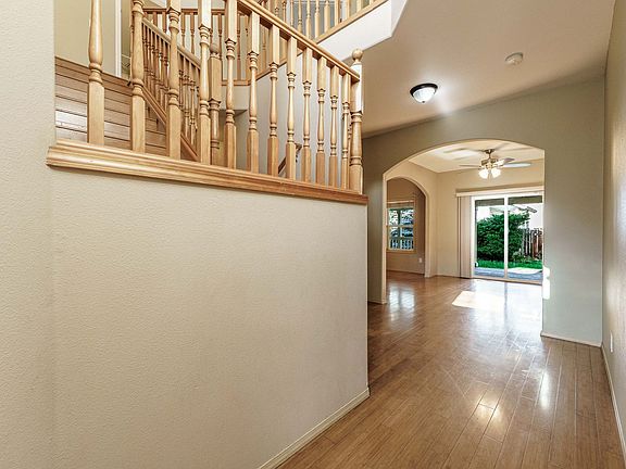 A vaulted entryway welcomes you inside, creating an open first impression. Just off the entry is a dedicated office, ideal for remote work or additional storage. The main level includes an arched architectural detail that adds character to the flow between the living, dining, and kitchen areas. The kitchen features a kitchen island, and the dining area includes a sliding glass door leading directly to the outdoor space.