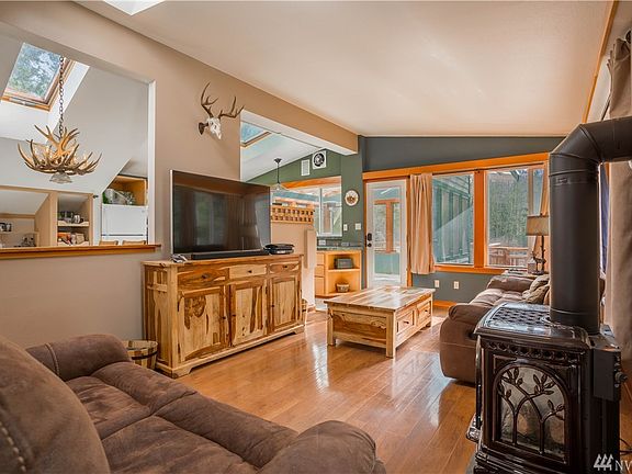 Take advantage of the PNW in this two story getaway less than 10 minutes from town! Located in a gated community, this 3 bed 1.75 bath home on 9.75 acres features the privacy of the country with all of the modern conveniences. Enjoy the outdoors year-round with the wrap-around deck, screened sun porch, fire pit, and skylights. Adding to the custom appeal: loads of storage, freshly updated shower, concrete kitchen counters, slate entry, generator hook-up, chicken coop, and NEW heated 840SF shop!
