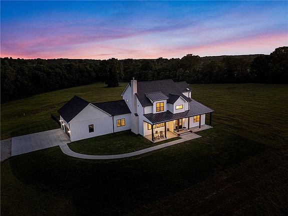 Discover modern country living at its finest in this brand-new 2024 modern farmhouse, nestled on 38+ wooded acres of privacy and beauty. Offering over 5,400 sq ft, this 1.5-story home features 7 bedrooms, 5.5 baths, and a 3-car garage, blending timeless design with today’s most sought-after amenities. A gated entry and tree-lined driveway lead to a welcoming covered front porch. Inside, soaring ceilings, expansive windows, and designer finishes create a bright, open atmosphere. The main level centers around a stunning stone fireplace, chef’s kitchen with Thermador appliances, quartz countertops, custom cabinetry, and a walk-in pantry. The dining space features a built-in beverage bar and flows seamlessly outdoors to a private backyard setting. The main-floor primary suite is a true retreat with vaulted ceilings, spa-style bath including dual vanities, soaking tub, rainfall shower, and an oversized walk-in closet with built-ins. Upstairs, spacious secondary bedrooms all enjoy ensuite or direct bath access. The finished lower level extends the living space with a large recreation room, two additional bedrooms or flex rooms, a safe room, and convenient walk-up/walk-out access to the outdoors. This one-of-a-kind estate offers the perfect balance of luxury, privacy, and convenience—just 35 minutes from KCI, near shopping and dining, within the award-winning Basehor school district, and with easy access to Kansas City.