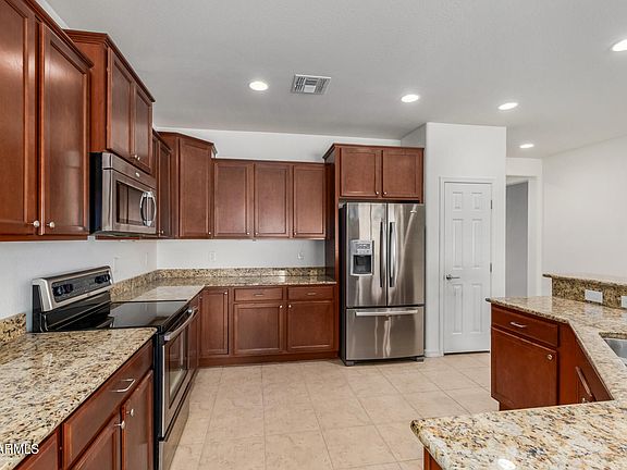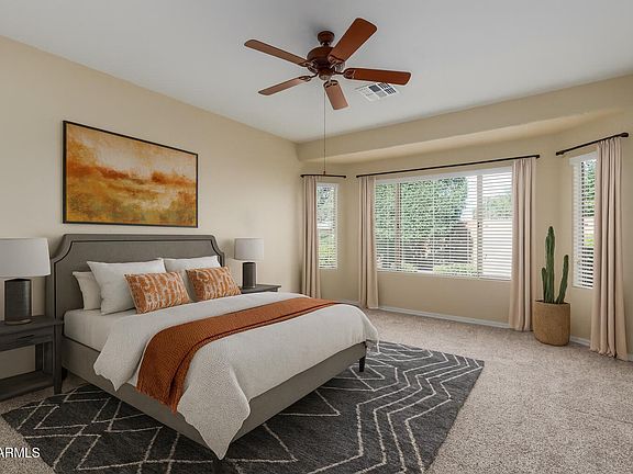 This 2 beds plus den, 2 bath Gala model in the Active Adult side of Sun City Festivals is available! Owned Solar! Featuring a 2.5 car garage, manicured landscape, and a gated courtyard. Inviting open floor plan sets the stage for a delightful living experience, enhanced by tile flooring, fresh neutral paint and an abundance of natural light. Renewed kitchen offers recessed lighting, a pantry, staggered cabinets with crown molding, SS appliances, granite counters, and a center island with a breakfast bar. Large master bedroom is complete with plush carpet, sunny bayed window sitting area, a private bathroom with dual sinks, and a walk-in closet. PLUS, a dedicated den/office! Spacious backyard with a covered patio is perfect for hosting lively gatherings or unwinding.