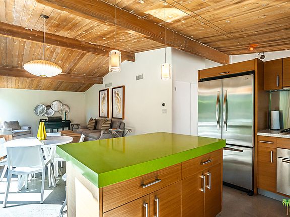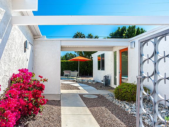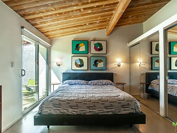 Nestled at the end of a cul de sac in the Racquet Club Estates neighborhood, this gable roofed PALMER AND KRISEL designed home delivers incredible views from its front office/den clerestories and from the pool area. The pool and deck were revamped in 2016, plaster and tile, gas heater, all plumbing, and variable speed pump were replaced then. Inside, the sandblasted beams and tongue and groove vaulted ceiling unifies the home with an open Kitchen, dining, living room that look out to a grassy yard and the sparkling blue pool. With the center bedroom opened up as an office den, light pours in from the hallway. A stacked LG washer and drier, guest bathroom and guest bedroom with views all adjoin the hallway. The owner's suite has two closets, a sliding door out to a sitting patio and an en-suite bath with walk in shower and a door to the yard. The two car garage is finished inside with a painted floor, cabinetry with sink, and a locking storage closet.