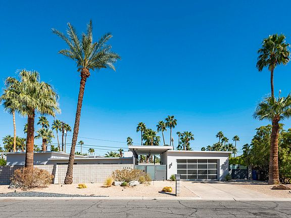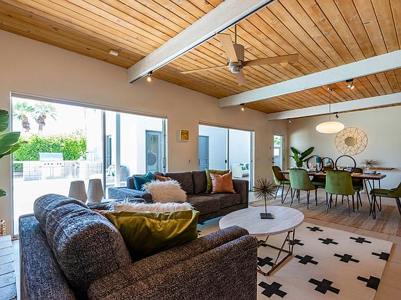 Located in one of Palm Springs' most iconic midcentury neighborhoods, this architectural property offers the scale and privacy of a compound, with four bedrooms and five bathrooms. Originally designed and built by Jack Meiselman in 1959, it has since undergone a transformation and expansion with numerous upgrades and modern amenities. The three bedroom main house features dual master suites, an upgraded kitchen and great room, a guest bedroom and a home office den. The property also includes a separate casita with bath, an exercise room, an outdoor kitchen featuring Viking appliances, a poolside bath, an oversized resort-style swimming pool and elevated firepit seating area with dramatic mountain views. Midcentury details such as tongue and groove ceilings and a block fireplace sit elegantly alongside modern elements such as LED lighting indoor and out, Bulthaup kitchen cabinetry, and Miele appliances. Expansive and private outdoor entertaining areas make this house a true standout. No land lease and no HOA. Great vacation rental potential -- or simply a private compound for you and your closest friends. Midcentury re-imagined at its modern-day best.