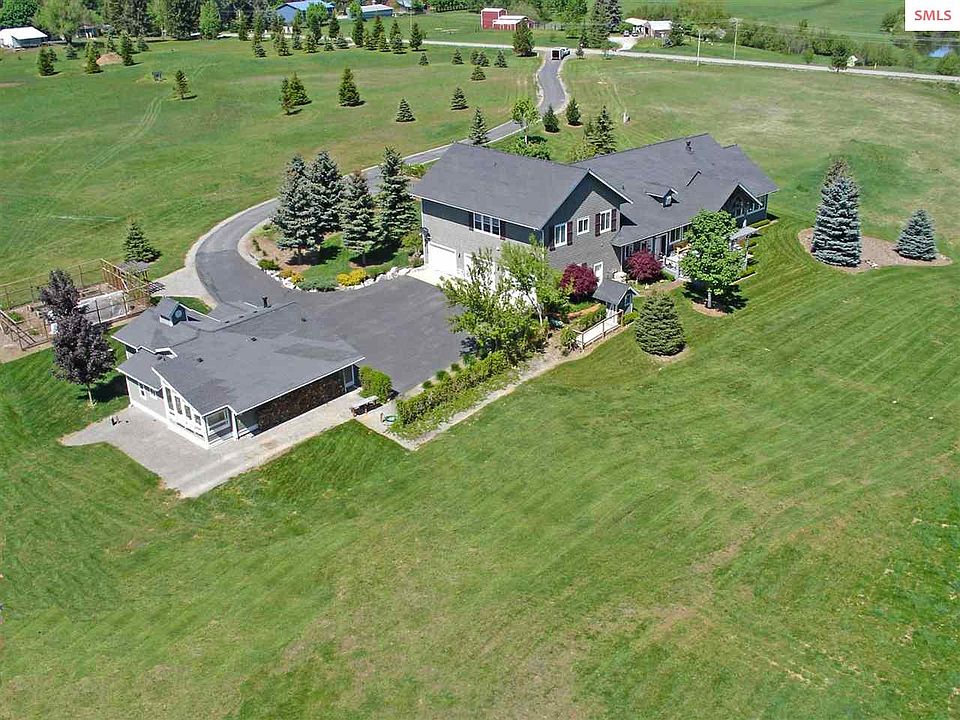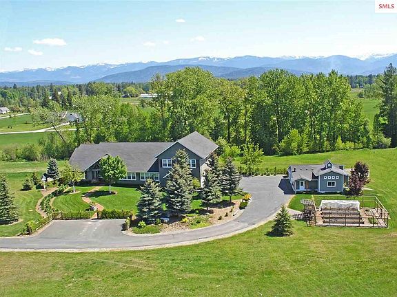 Custom-built with superior finishes & attention to detail! Situated on 10 acres with 4,370sf, oversized 3-car heated garage & RV pad w/hook-ups. A welcoming entry that opens to the living room, floor-to-ceiling rock fireplace, vaulted exposed timber beam ceilings & beautiful wood floors. Fully equipped Gourmet kitchen w/island (black walnut), granite counters, SS appliances and a walk-in pantry. Luxurious master suite w/sitting room & fireplace, walk-in shower, soaking tub, walk-in closet & access to the covered deck. Separate 2nd master suite on the main level & 3 additional bedrooms, an office & family room. Forced air gas heat & central AC. The heated shop includes a kitchen, bathroom (guest area started) & greenhouse. Exterior amenities include manicured landscaping, enclosed garden with raised beds and pasture for your horses. Close to town on a paved county maintained road w/terrific internet! Exceptional setting with panoramic views of the Mountains & in a desirable location!