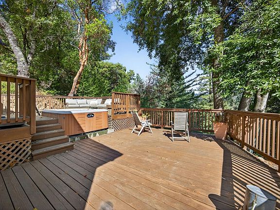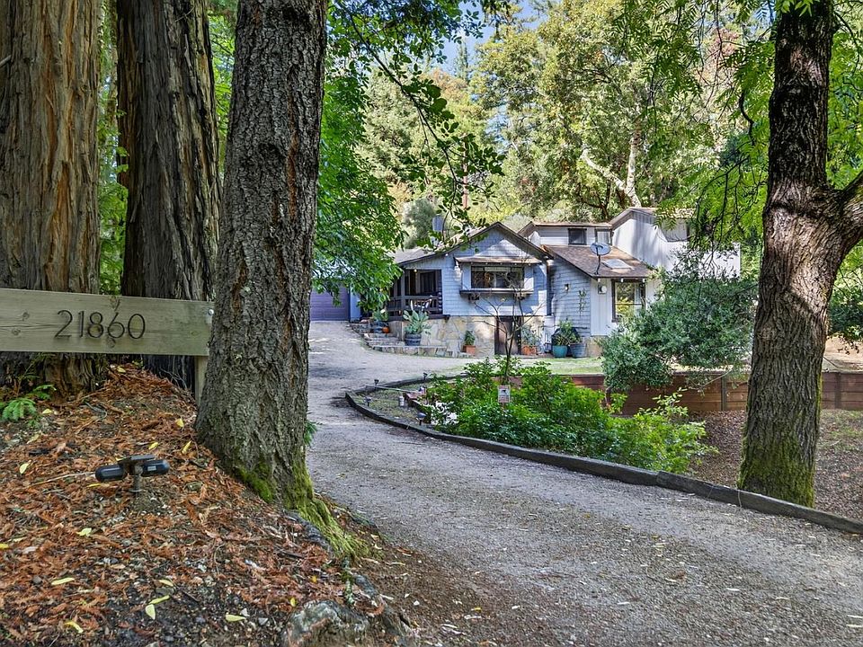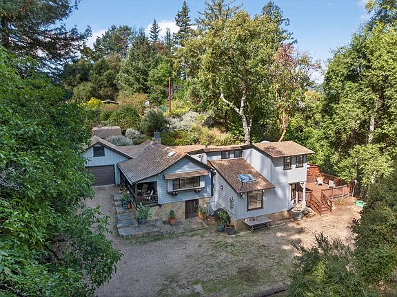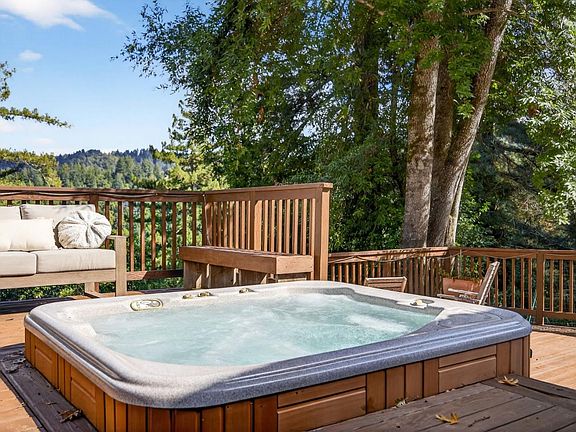 So much newness! Expanded from original cabin around 2008. Since 2021: New oak floors, new whole house generator, new steel ducting, much more. Charming 4 bd. 3.5 ba. home is modernized and part of Los Gatos history. Primary plus one more en-suite bdrm! Natural light fills the living areas including the kitchen where a large center island, gas stove, and lots of counter space make cooking a joy! The primary suite opens to the back deck with beautiful views and features a walk in closet and oversized tub for the ultimate relaxation. One additional en-suite room, plus 2 more bedrooms! An inviting living room with cozy Jotul gas stove opens to the back deck where the jacuzzi awaits. What is a mtn. home without a wood-beam ceiling wine cellar? Keep your collection cool in this fun space! Steps away, a separate stand alone office space, updated in 2024 and now complete with AC/Heat, recessed lighting, and more, perfect for work-from-home, she-or-he-shed or other! Frontier fiber ready, Starlink available. 3.5 ac. lot, some usable land! Fruit trees produce in abundance, chicken coop is ready for your chickens, sun and shade, this is a truly beautiful setting! It's quick and easy to get onto Bear Creek Road and then you are just 8.7 miles into downtown Los Gatos. Los Gatos schools!