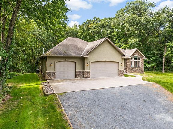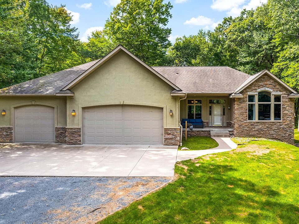 Gorgeous home with a lot of natural light. Open floor plan with vaulted ceilings. Stunning spacious kitchen with stainless steel appliances, sub-zero refrigerator, Cambria and large breakfast bar. Living room is warm and inviting with stone gas fireplace and built-ins. Owners suite includes trey vault ceilings, master bath with separate whirlpool tub/walk-in shower and double vanity. Huge lower level family and game room perfect for entertaining. All located on private wooded acreage.