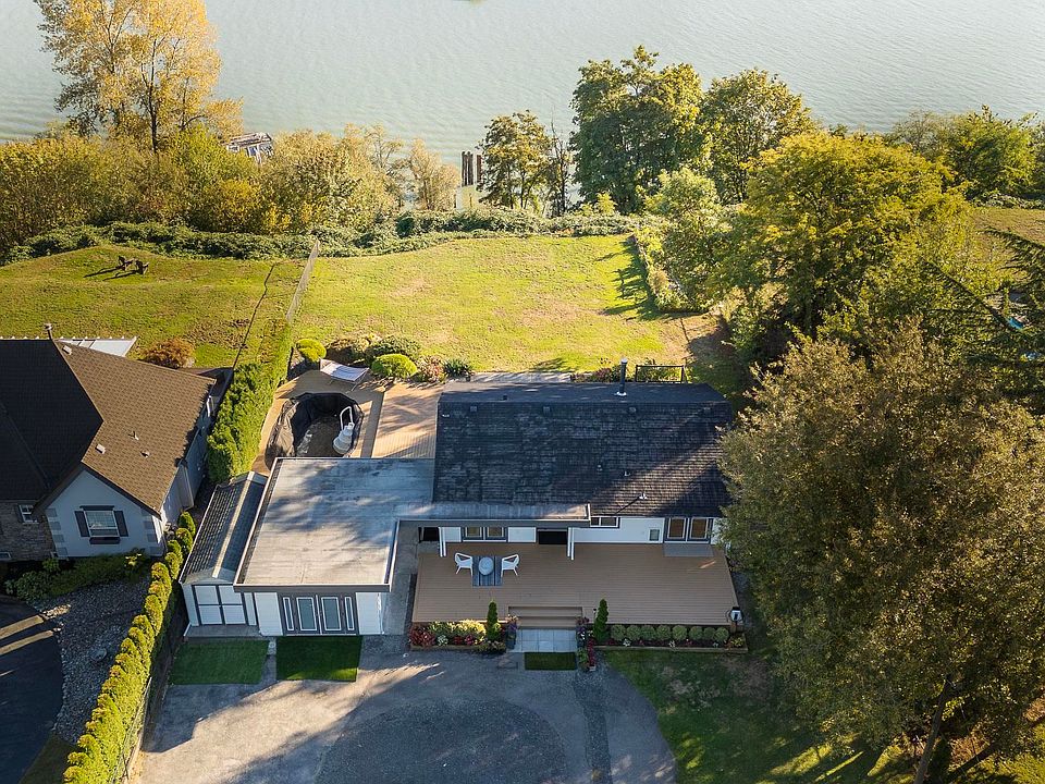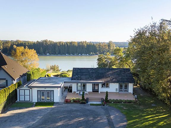 Fraser River southern-exposed waterfront in one of Maple Ridge's most exclusive neighborhoods. Bathed in natural light w/ panoramic river & mountain views from the living, dining, and primary bedroom, this 4-bedroom renovated rancher is a rare find. The open-concept kitchen & living area flow to a fully finished, suiteable basement w/ family room & separate entrance. Don't miss over 2,000 sq.ft. of deck space, & detached rec room for extra family living. All sitting on a flat 16,000+ sq.ft. lot, offering incredible potential to expand or build your dream home. BONUS walking distance to Maple Ridge Hospital, & just 10 minutes to Meadowridge School. Inground pool in place, quotes available for a new liner & equipment. Gated property, by appointment only. Drone and walk-thru video attached.