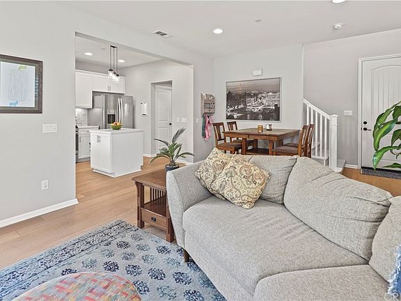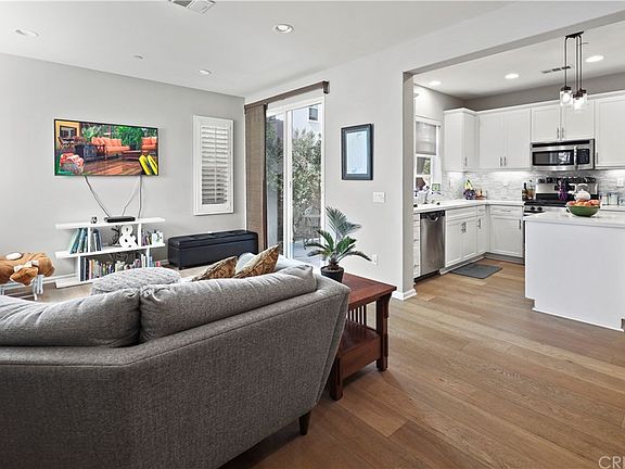 Gorgeous turnkey 3 bedroom home located in the popular Villa Metro community. Updated kitchen is open to the living room. Beautiful finishes throughout the house include stunning hardwood floors with a french oak look, white cabinets, neutral quartz counter tops and backsplash, kitchen island, stainless steel appliances, upgraded carpet on second floor, and plantation shutters. All bedrooms located on the second floor. The master suite offers an en-suite bathroom and walk in closet. Laundry located upstairs for convenience. Two car garage attached. Outdoor space has been done with pavers and tall greenery to create privacy. The neighborhood is the only one of its kind in Santa Clarita with resident owned businesses on the main street. Walk on over to Prima Way to take a Pilates class or relax while getting your nails done at one of the few salons available. Cool off in the luxury resort style pool during the warm summers while grilling on the BBQ and enjoying time with neighbors. The grounds are luscious with plenty of green space and there is a community garden for residents use. Playground is great for kids to get outdoors and play. Close to restaurants, shopping and public transportation, this home is sure to impress!