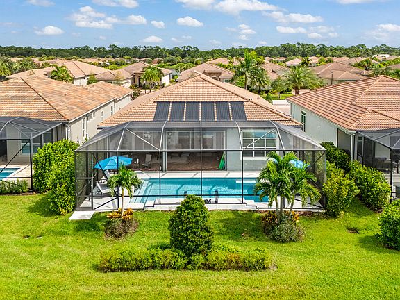 Welcome to luxury living in this beautifully upgraded 3,000sft home, located in the prestigious PGA Verano golf community. Step inside to discover a bright open floor plan fully tiled throughout, enhanced by elegant crown molding and custom wall moldings in the dining room and den. Plantation shutters, upgraded fans, and designer light fixtures add a refined touch throughout the home. At the heart of the home lies a spacious open-concept kitchen, featuring a massive quartz island, sleek white cabinetry, wall oven, and stainless steel appliances--a chef's dream and an entertainer's delight. Enjoy indoor-outdoor living year-round with a screened-in, solar-heated pool and expansive lanai, complete with electric-powered storm screens for added weather protection. The private backyard backs to a wide canal, providing a serene setting for relaxing or entertaining. All windows and doors are impact glass, offering both safety and energy efficiency. The home also includes a 3-car tandem garage and a large laundry room with ample storage. Located in the gated community of PGA Verano, residents enjoy access to a state-of-the-art clubhouse, fitness center, pickleball and tennis courts, and a full calendar of social events. Golf enthusiasts will appreciate the private golf cart path to the nearby PGA Golf Clubmembership is optional and subject to availability. HOA dues include: basic cable, high-speed internet, alarm monitoring, lawn care, common area maintenance, gated security, and more. This is more than just a homeit's a lifestyle. Don't miss your chance to own this incredible property in one of the Treasure Coast's premier communities!