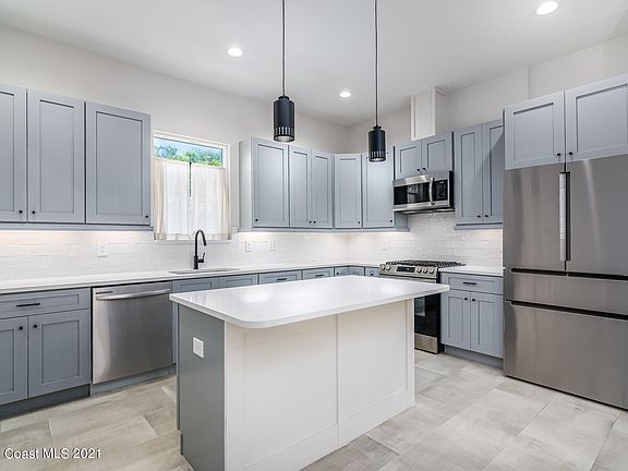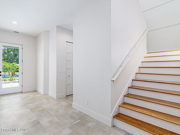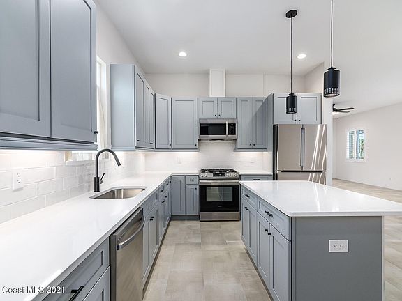 NO HOA! Just 5min. to great downtown Melbourne & 12 to the beach! SIGNATURE DETAILS w/open concept, high ceilings & 8' doors define this comfortably modern home. Muted grey tile flooring underscores all living/wet areas. A contemporary euro chandelier takes center stage in the casual dining rm. The entertainer's kitchen offers SS appliances, a gas stove, gray wood cabinetry & subway tile backsplash. An extended bfast bar w/ pendant lighting invites everyone to gather. The generous great room is accented w/ sliders to a covered lanai & alfresco patio overlooking the golf course & fenced backyard. The gorgeous white quartz enhances all kitchen & bath counters. Tastefully selected tile and flooring create an easy maintenance lifestyle. Metal roof & hurricane-rated windows protect this home!