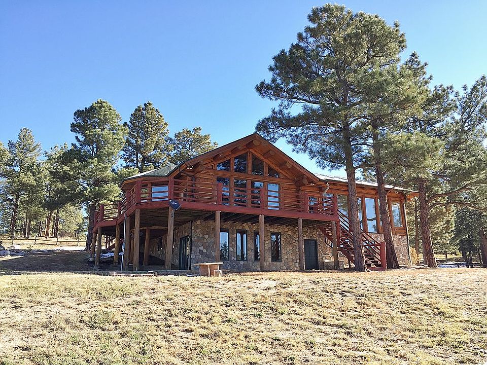 Gorgeous log home nestled in the trees on 26 acres w/ breathtaking views of the Front Range. A very desirable open floor plan with gourmet kitchen that includes stainless steel appliances, a farm sink plus a beautiful circular dining area with outstanding views. The stunning great room with its massive log beams and vaulted ceilings has a floor to ceiling stone fireplace and large windows to enjoy the expansive views and a walk-out to the deck. French doors lead you through to the master retreat which features a floor to ceiling stone fireplace and a spa with slab granite counters, heated slate tile floor, shower and a claw foot tub. Completing the main level is a huge sunroom with skylights. The lower level features a walk-out family room with wet bar, two additional bedrooms, a ?? bath and a large utility/laundry room.