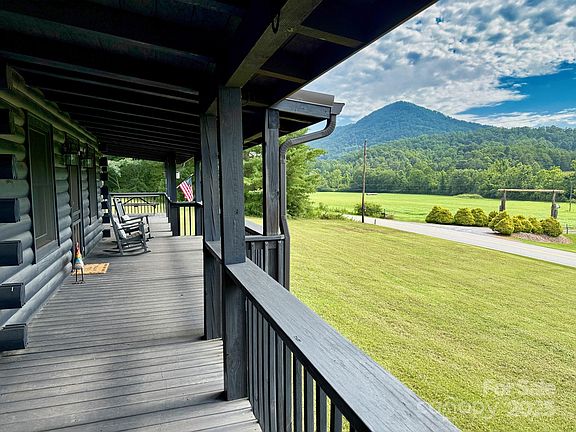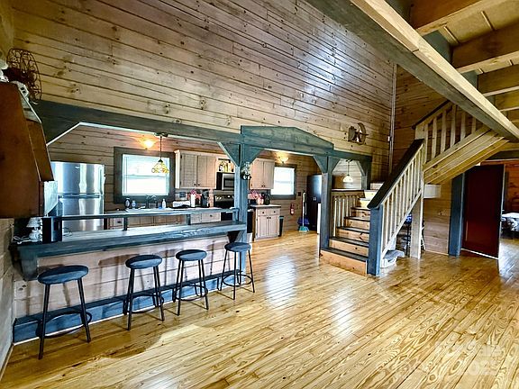 This striking log cabin sits on just over an acre of peaceful land, with a full-length covered porch that stretches out toward open fields and close-range mountain views. Inside, the open-concept layout welcomes you with vaulted ceilings, custom cabinetry, and warm wood accents that give it that classic cabin feel, with modern comfort.