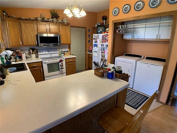 Amazing acreage on pavement! This easy living ranch home has a nice spacious living room, huge dining room, spacious kitchen with ample cabinet and countertop space! There is a master bedroom suite as well as a second bedroom and full bath. The walk out basement has a second master suite as well as another bedroom and family room area. The 2 car attached garage has tons of storage space and is heated! You will love the huge 40x80 outbuilding as well as a 30x40 finished amazing shop that is insulated and heated! There is a chicken coop and dog kennel already set up! There is plenty of room to add or expand on the 10+ acres! Covenants so bring your horses and 4-H animals! Don't miss your chance to own this piece of heaven!