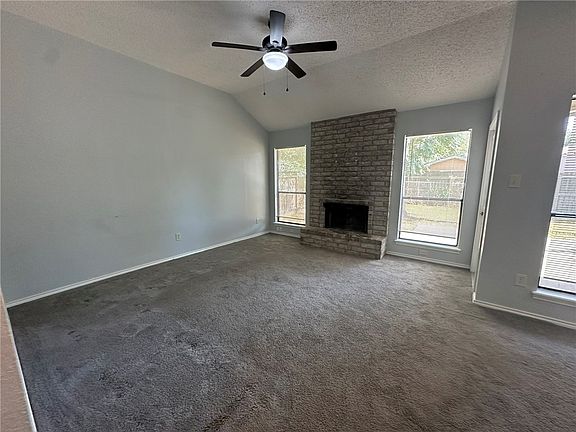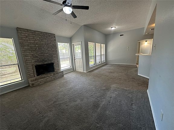 Nestled in a lovely neighborhood, this three-bedroom, two-bath home is ready for move-in. The bedrooms and living/dining areas are carpeted. Unfortunately, pets are not allowed. The open floor plan keeps the cook connected to the conversation while preparing meals. The cozy kitchen features a new electric free-standing range, vent hood, dishwasher, Formica countertops, and wood cabinets, along with a breakfast bar that seats four. A wood-burning fireplace serves as the centerpiece of the living area, adding warmth on chilly Texas nights. The split floor plan provides privacy, with a bath featuring a tub/shower combo and ample closet space. Two additional bedrooms and another bath, also with a tub/shower combo, are located off the kitchen. The fenced backyard offers privacy and is shaded by palm trees, an orange tree, and others. The two-car garage includes an opener and convenient washer and dryer connections.