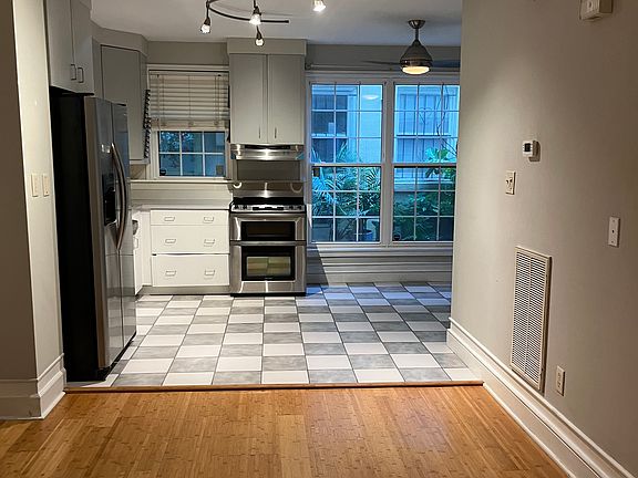 The apartment is unfurnished and features an open floor plan with a fully-equipped eat-in kitchen that connects to the living room/sitting area. The kitchen includes new stainless steel appliances, a stackable washer/dryer and updated countertops/cabinets that overlook our buildings beautiful courtyard.