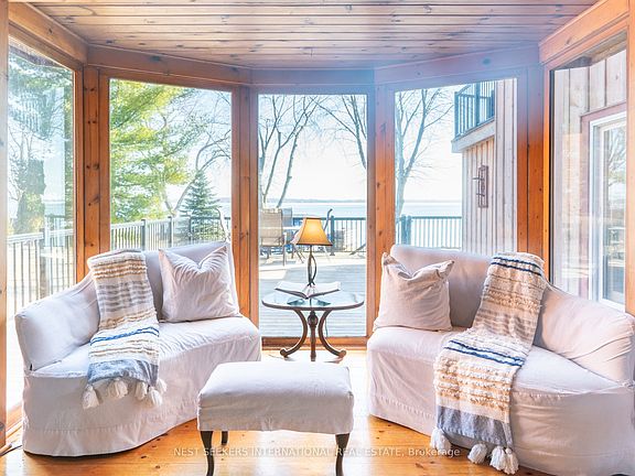 This is your chance to achieve your waterfront dreams! Rare 69 feet of pristine waterfront frontage on Lake Simcoe in Cooks Bay! This fully winterized, year-round haven is the perfect marriage of history meets modern living! Originally erected in 1872 on Bear Lake, this log home was meticulously reconstructed in 1979 on a new foundation in the sought-after community of Gilford. Steeped in history, this home boasts a beautiful stone fireplace and stunning beams. Original pine floors throughout. Marvel at the breathtaking views through the floor to ceiling bay windows. Step into the spacious kitchen, flooded with natural light featuring an island, built-in desk, pantry and walk-out to massive deck. Generously sized bedrooms and primary featuring a private balcony with large awning. The basement offers an office or additional bedroom, along with a welcoming fireplace and bar area for entertaining guests, laundry and bathroom. Detached, fully insulated garage with a loft (both R20 drywall, fully painted) presents endless possibilities. Complete with its own deck with captivating views of Lake Simcoe. Whether utilized as a guest retreat, home office or creative studio. This property features its own private dock and marine rail. Truly a haven of charm and history, promising a lifestyle of serenity and enjoyment amidst nature's beauty. This one of a kind property is a must-see! There is truly nothing like it. Book your private showing today and experience the unlimited potential of this stunning home!