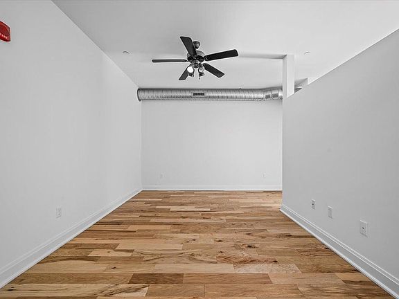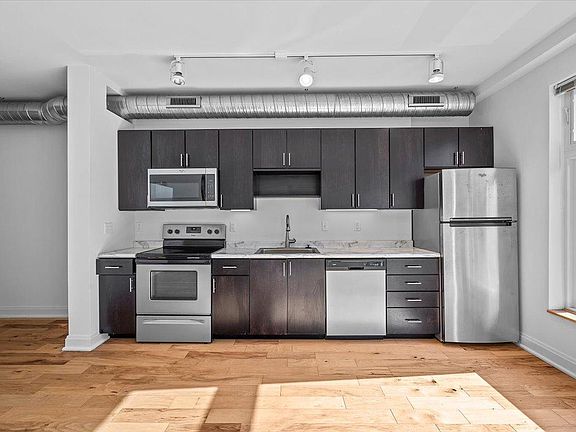 First-floor residence located in a loft-style apartment building with elevator access; central air conditioning; hardwood floors; high ceilings; open kitchen with stainless steel refrigerator, range, microwave, and dishwasher; private washer/dryer in apartment; patio; garage and off-street parking available for an additional monthly fee.