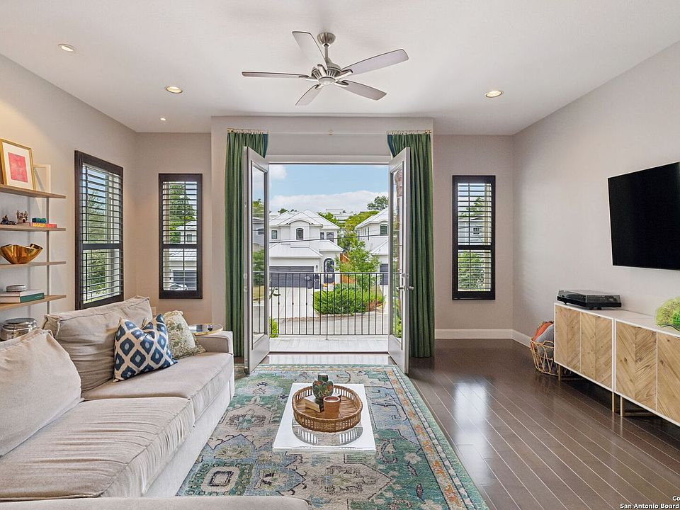 Stunning interior design and custom upgrades define this lock-and-leave Olmos Park townhome built in 2017, offering 3 bedrooms, 3 full baths, and 1 half bath. The open-concept living, dining, and kitchen space features wood flooring, quartz countertops, gas cooking, two wine fridges, and shutters throughout. The primary suite includes a coffee bar, dual vanities, separate shower and soaking tub, and a large walk-in closet. Each secondary bedroom offers an en-suite bath for privacy and convenience. Off the kitchen, a balcony overlooks the yard; on the ground level, a large patio with built-up grill opens to landscaped greenspace with sprinkler system, ideal for low-maintenance outdoor living. A two-car attached garage provides secure parking and storage. Located in the historic enclave of Olmos Park, this residence combines neighborhood charm with easy access to San Antonio's most popular destinations. Rose Hip Market is just 0.3 mile (6 min walk) for fresh groceries, and Olmos Pluma Coffee Bar sits 0.9 mile away (18 min walk) for morning coffee. The San Antonio Zoo and Brackenridge Park are 1.0 mile (20 min walk), offering nearby recreation and green space. Within minutes, enjoy the Alamo Heights Dog Park (2.1 mi / 7 min drive) or explore dining and shopping at The Pearl District (2.6 mi / 9 min drive). The Methodist ER Alamo Heights (2.1 mi / 6 min drive) and San Antonio International Airport (5.1 mi / 12 min drive) provide everyday convenience for travel and healthcare access. Zoned to Alamo Heights ISD, this beautifully appointed home delivers refined design, thoughtful upgrades, and a connected, low-maintenance lifestyle in one of San Antonio's most desirable neighborhoods.