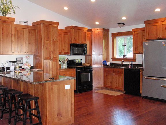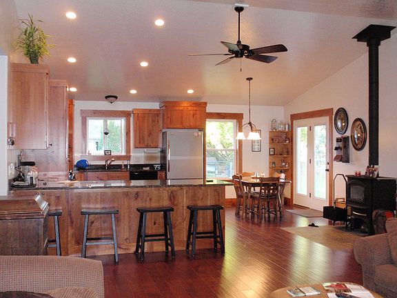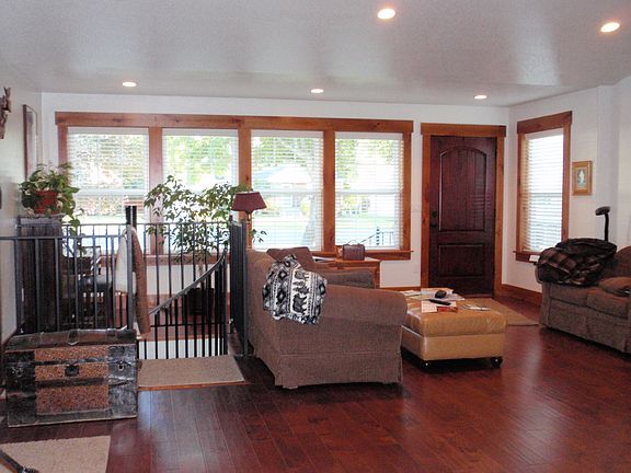 Single family home like new. Built in 2012. Ranch style with two bedrooms on main level and two basement bedrooms. Two full baths on main level and one full bath in basement. Large living/kitchen area with energy and emission wood stove and wood flooring. Spiral stairs to basement. Also wide regular staircase to basement from large two-car garage. Sits on 3/4 acre with mature trees and well-built, insulated shop/shed.