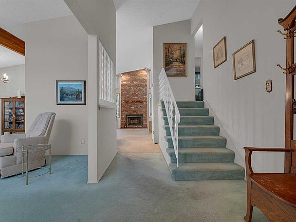 Beamed ceilingsWrought iron detailsPlush carpetHuge windowsSlanted roofBig roomsGood sized kitchen