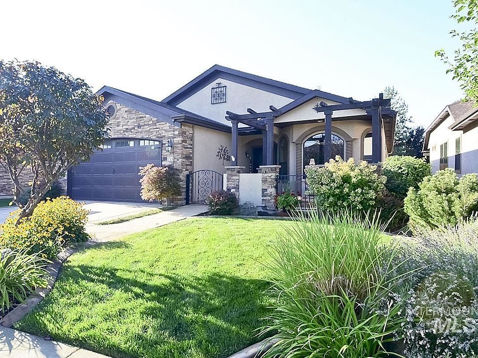 Beautiful Ted Mason home in the La Mirada community! Tranquil water feature on the front courtyard plus covered back patio on one of the largest lots, provides relaxing outdoor enjoyment. Humidifier installed to stabilize the beautiful hardwood floors, custom cabinetry, granite countertops & breakfast bar w/ stainless steel appliances, plus coffee "cubby". Large master suite, private bath, tile counters, dual vanity and full-tile, walk-in shower. Bedroom #3 has an armoire that is used as the closet. This room currently being used as a home office. Oversized garage can fit up to 4 vehicles. Community Pool & Clubhouse!
