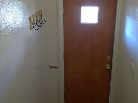 There is a window in the front door and a patio for a swing, barbecue, etc.