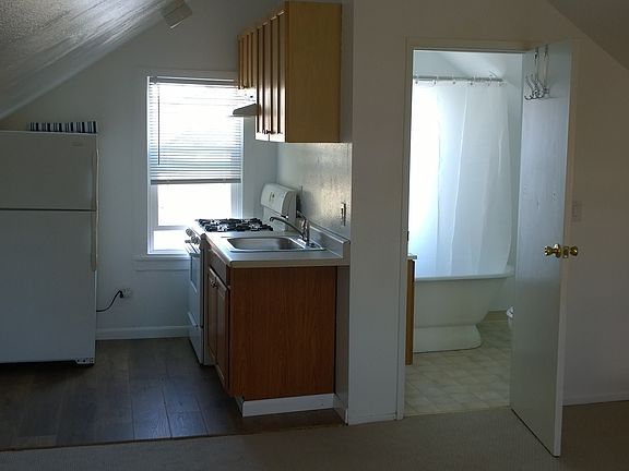 stove and large sink. There is a spacious bathroom with bathtub, sink and
